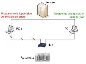 Ainsi si votre supervision est arrêtée anormalement (plantage du sytème, PC ou pupitre de commande Hors service...) une deuxième application identique, sur un second poste du réseau, prend instantanément le relais vous assurant alors une sécurité optimum.