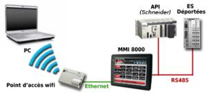 Le point d'accès se connecte au port Ethernet du pupitre, le rendant ainsi accessible en wifi sans paramétrages supplémentaires. La connexion entre le PC et le MMI se fait par wifi, il est alors possible de récupérer le projet, les journaux d'alarmes et les fichiers courbes de l'afficheur. La connexion entre le MMI et l'API via un port série, permet avec la fonction passerelle(2) du pupitre de récupérer et charger le projet de l'automate.